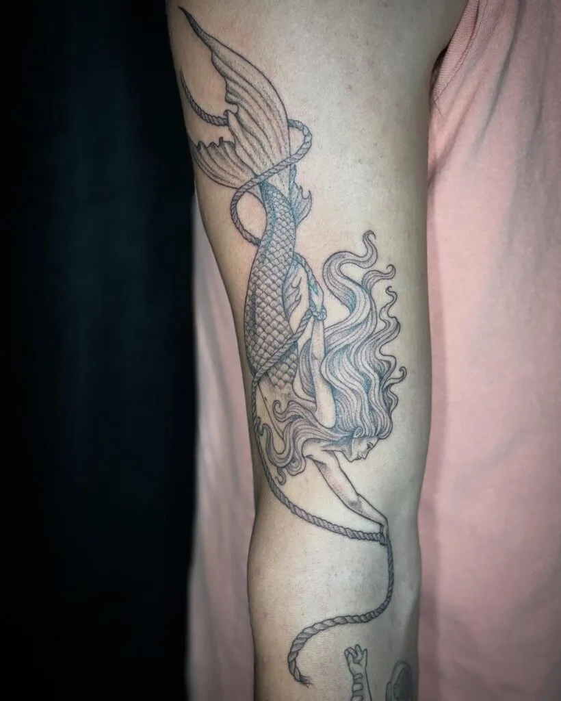 This black-and-gray design captures a mermaid descending gracefully, her flowing hair and detailed scales adding elegance to the composition. She holds a rope, reaching down to a hand below—symbolizing salvation, guidance, or connection between worlds. The artwork balances fluid movement with strong detail, creating a story-driven tattoo.