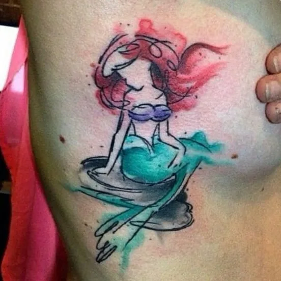 This creative piece takes inspiration from The Little Mermaid, with a unique watercolor and sketch effect. The mermaid is drawn with loose, artistic strokes, combining splashes of red, teal, and purple for a lively, unfinished look. Her playful yet mysterious pose adds to the modern, edgy feel of the tattoo.