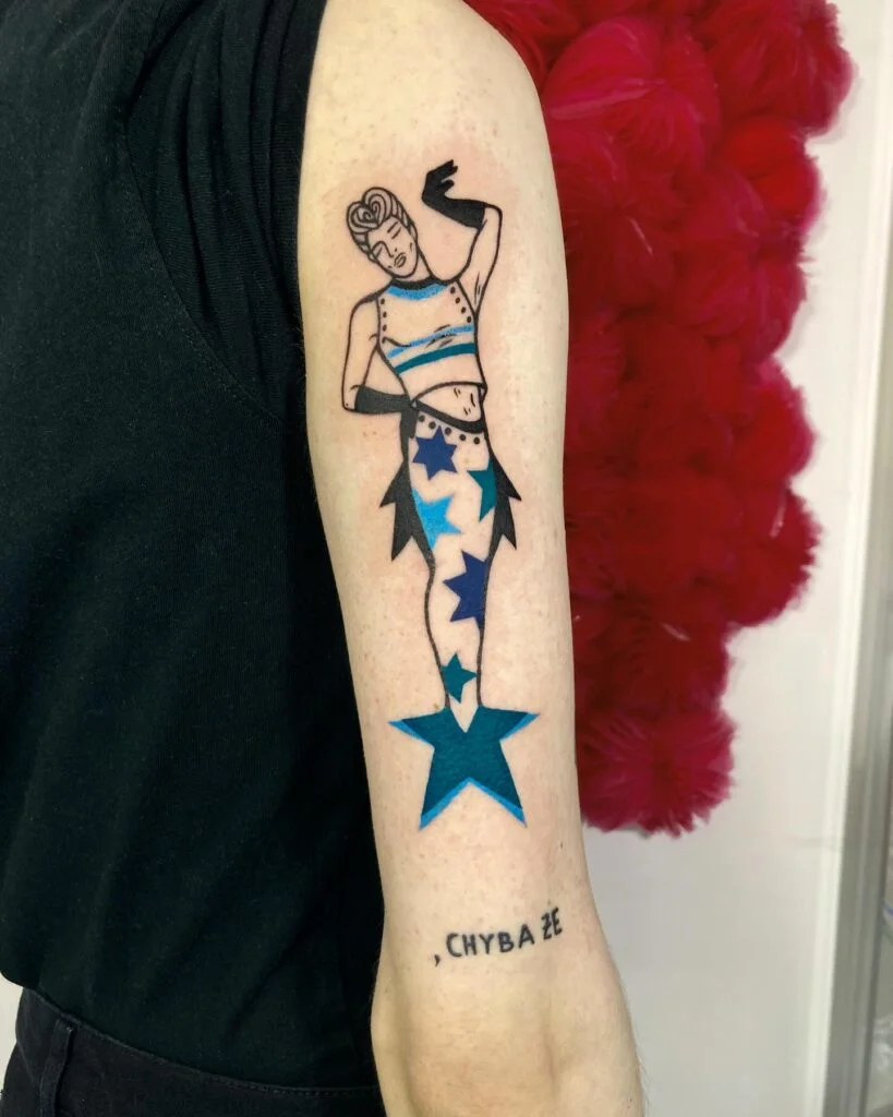 This playful tattoo reimagines the mermaid with a bold, retro-art aesthetic. Instead of traditional flowing scales, her tail is composed of blue and black star patterns, giving her a modern, stylized edge. Strong black outlines and minimal shading keep the design clean, while splashes of turquoise blue add vibrancy.