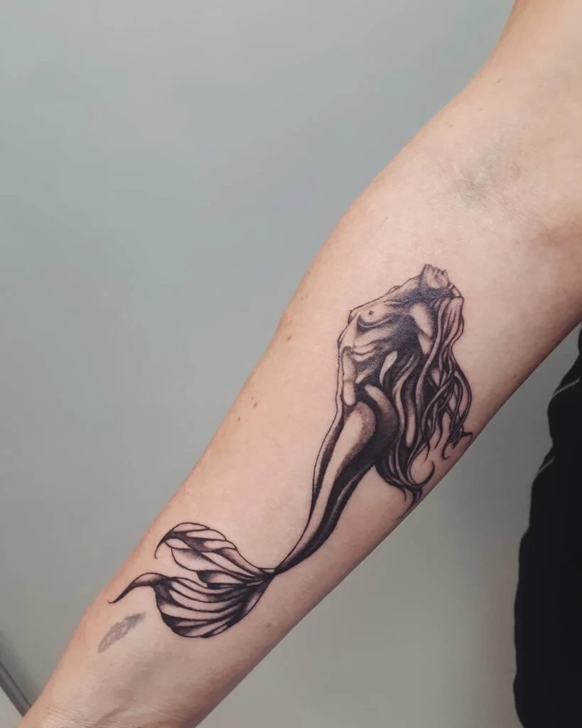 This striking forearm tattoo showcases a powerful mermaid in bold black shading, her body and scales detailed with depth and texture. The piece commands attention, with sharp contrasts and careful highlights that give it a three-dimensional feel.