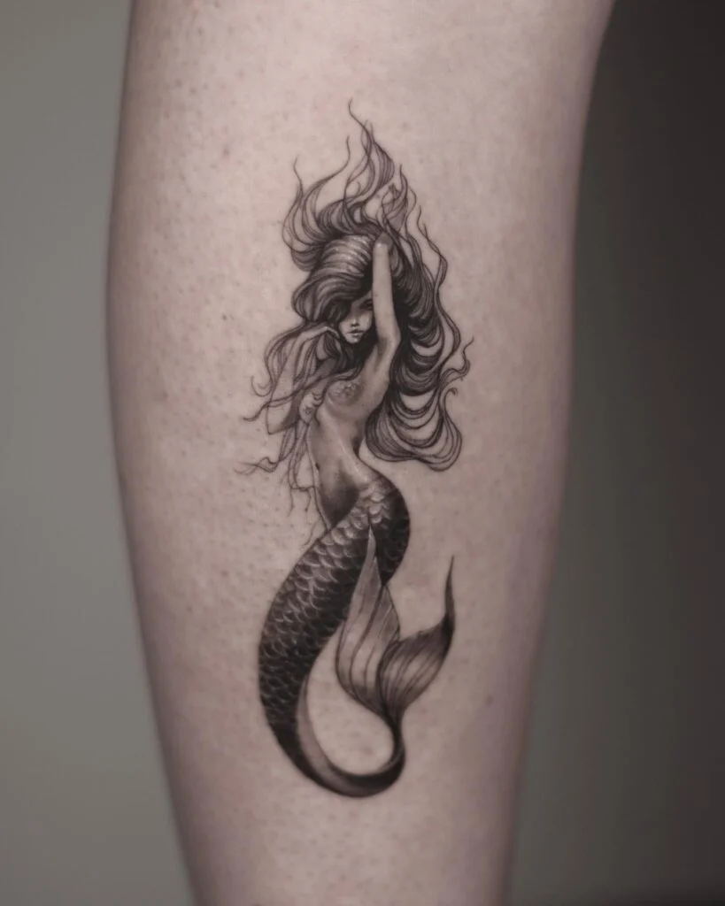 Rendered entirely in black ink, this tattoo features a mermaid with intense detail, her hair flowing wildly like smoke or flames. Her scales shimmer through delicate shading, while her confident pose gives the piece both sensuality and power. The lack of color enhances the dramatic contrast, making it appear like a fine-art illustration etched into skin.