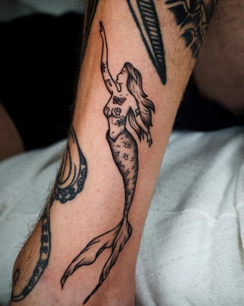 This tattoo pays homage to old-school tattooing traditions with its heavy outlines, bold black shading, and simple color contrasts. The mermaid, with vintage-style hair and a coiled tail, exudes retro charm. Her pose is reminiscent of sailor tattoos from the mid-20th century, tying into maritime culture and classic tattoo history.
