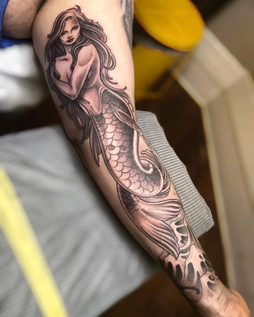 The artist’s use of shading and blue accents highlights her scales and aquatic surroundings, from jellyfish to bubbles floating around her. She holds an eel-like creature, symbolizing mastery over the mysterious sea. This tattoo captures both elegance and strength, ideal for someone who sees themselves as powerful yet deeply connected to nature. It transforms the arm into a storytelling canvas of mythical ocean magic.