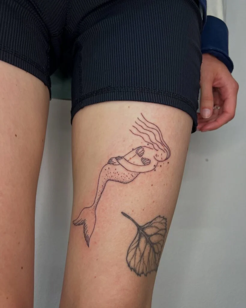 This charming thigh tattoo features a simple, whimsical mermaid drawn with light linework. Her playful posture, with closed eyes and shell bra, gives her a cartoon-like innocence. The design avoids heavy shading or color, instead focusing on clean outlines and a youthful vibe.