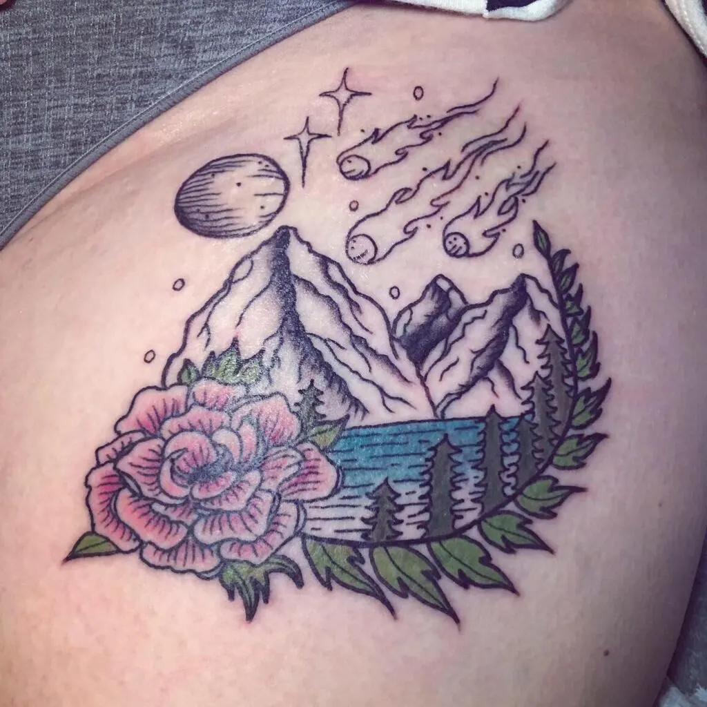 This tattoo perfectly blends natural landscapes with the limitless sky, symbolizing harmony between earth and the universe. It feels timeless and adventurous, appealing to dreamers, travelers, and those who find peace in both mountains and stars.