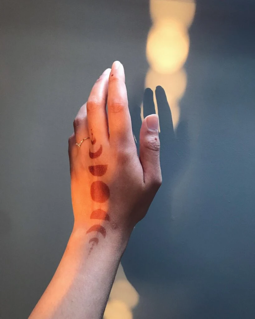 7. Moon Phase Wrist Tattoo in Golden Light