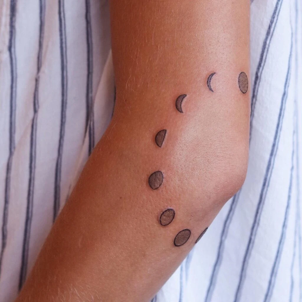 A delicate moon phase tattoo that curves around the elbow, following the natural bend of the arm. The small, simple shapes make it an elegant and discreet design.