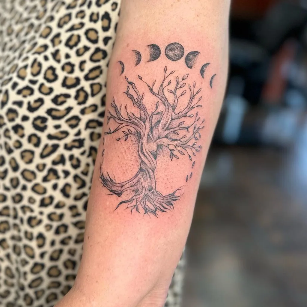 A mesmerizing tattoo combining the moon phases with a detailed Tree of Life. The moons arc above the branches, symbolizing the connection between cosmic cycles and earthly growth.