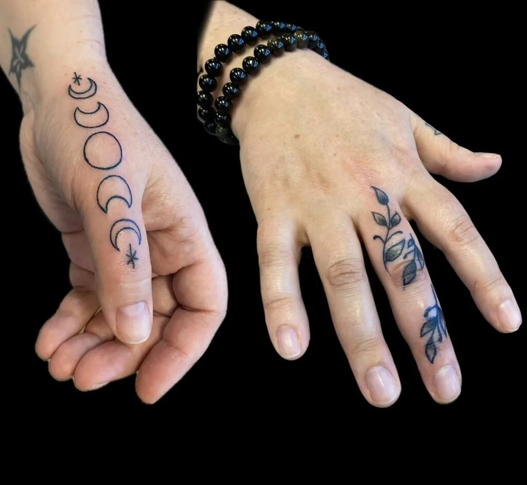 A simple yet charming tattoo on the side of the hand, showing moon phases and a small star at each end. Its fine line style keeps it light and feminine.