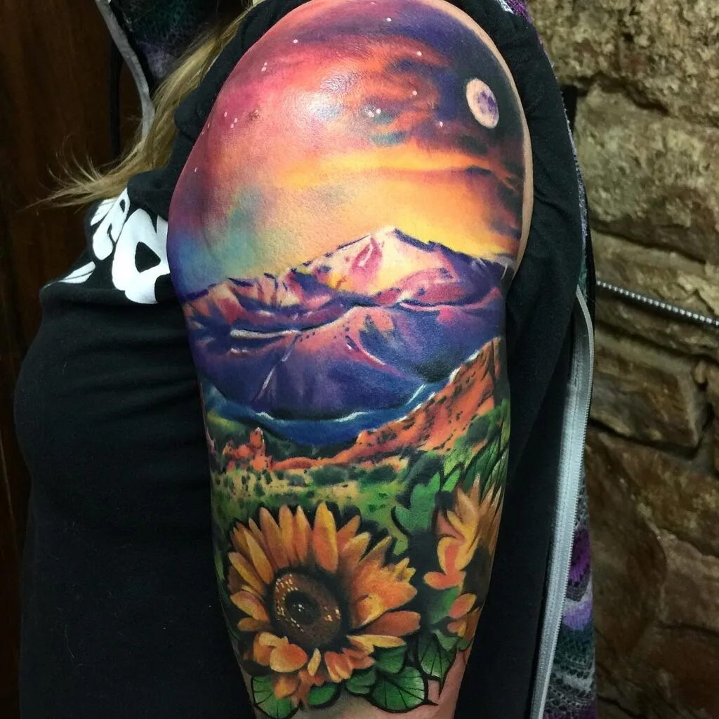 This vibrant shoulder piece blends cosmic wonder with earthly beauty. The tattoo showcases majestic mountains under a surreal night sky bursting with shades of orange, purple, and pink, crowned with a glowing moon. At the base, bright sunflowers add life and positivity, symbolizing growth, joy, and strength.