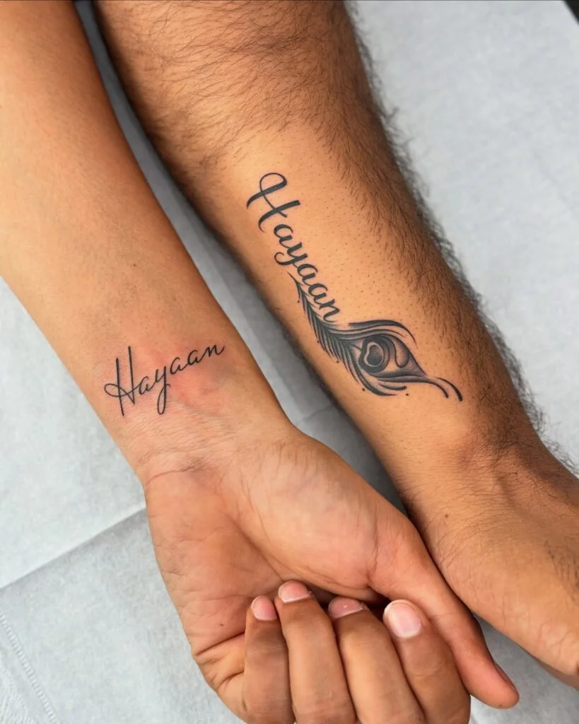 This tattoo concept highlights a pair of matching designs dedicated to the name “Hayaan.” One version uses fine cursive, placed delicately on the wrist, while the other combines bold lettering with a detailed peacock feather motif on the forearm.