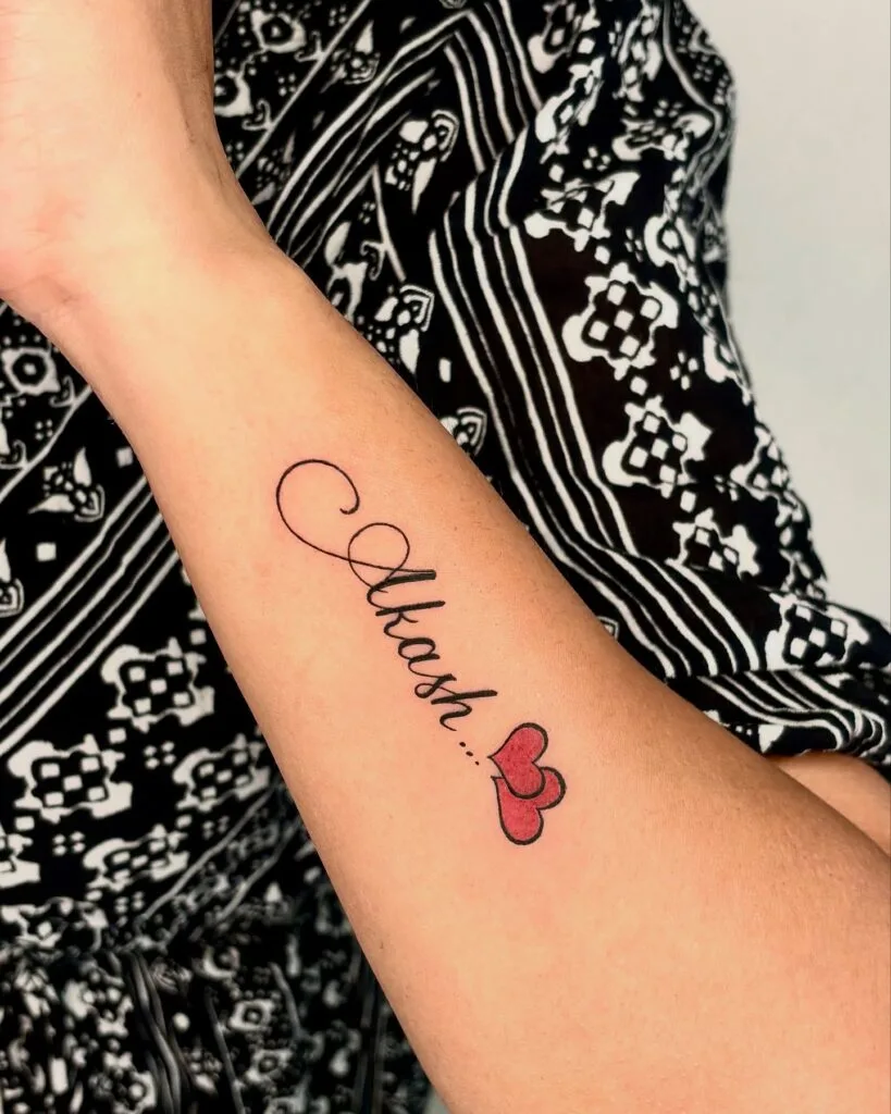 This tattoo beautifully spells out the name “Akash” in flowing cursive, ending with two vibrant red hearts. The hearts add a romantic and affectionate tone, making the tattoo both personal and visually striking. Placed on the forearm, it remains visible as a constant reminder of love and connection.