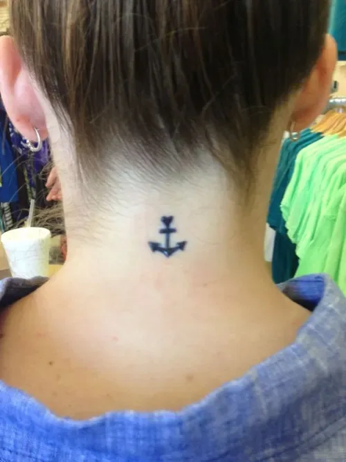 An anchor tattoo on the neck symbolizes stability, strength, and grounding. Anchors are associated with the maritime world and are used to hold ships in place, making them a powerful representation of staying grounded and secure in turbulent times. For a neck tattoo, an anchor can be placed on the side or back of the neck, either standing alone or incorporated into a larger design that includes ropes, waves, or other nautical elements. The tattoo can be as simple as a traditional anchor or more detailed, with shading and highlights to give it depth. This design is perfect for someone who values stability, personal strength, or resilience in the face of challenges. It also works well for those with a connection to the sea or a love for nautical themes. An anchor on the neck can serve as a reminder to stay grounded, even in life’s stormiest moments.