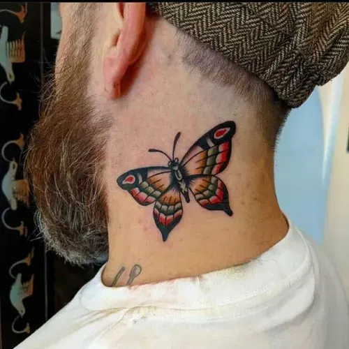 A butterfly tattoo on the neck symbolizes transformation, freedom, and the beauty of change. Butterflies undergo a remarkable metamorphosis from caterpillar to winged creature, making them powerful symbols of personal growth, renewal, and the ability to embrace new beginnings. For a neck tattoo, butterflies can be placed on the side, back, or even on the nape of the neck, where their delicate wings can be beautifully showcased. The design can vary from realistic representations, with intricate details of the wings, to more abstract or stylized versions that capture the essence of transformation. Butterfly tattoos can also be paired with other elements such as flowers, vines, or quotes, further enhancing their meaning. This tattoo is ideal for individuals who have experienced personal growth, those who embrace change, or anyone who seeks to represent freedom and the ability to rise above challenges. The placement on the neck gives the tattoo an elegant and striking appearance, allowing the wearer to showcase their personal transformation or inner beauty. Whether bold or subtle, a butterfly tattoo is a timeless and meaningful design, perfect for anyone who values the power of change and renewal.