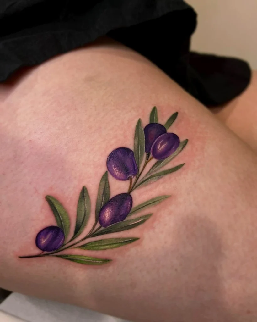 The vibrant colors give this tattoo a lively, eye-catching effect. Purple olives symbolize abundance and richness, combining beauty with deeper meaning. This is a great choice for someone who loves expressive, colorful body art tied to timeless symbolism.