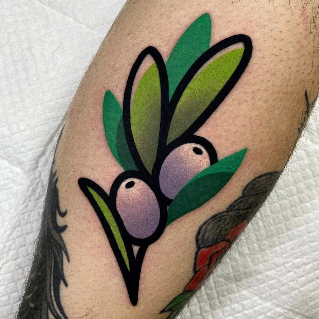 This tattoo presents a playful yet symbolic take on the olive branch, with its bold black outlines and soft purple olives that stand out against vibrant green leaves. The modern design feels both minimal and artistic, capturing attention with its sharp contrasts.