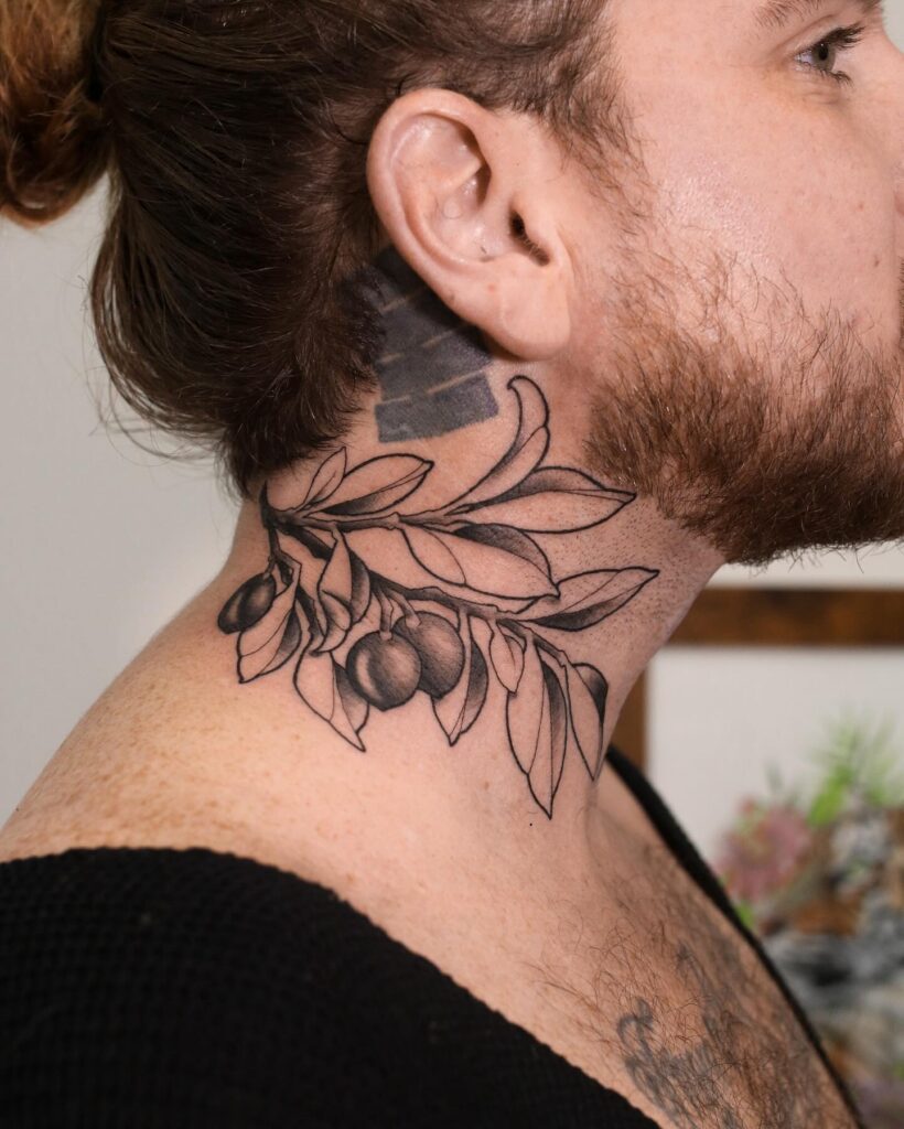 This striking tattoo stretches along the side of the neck, showcasing a detailed olive branch in fine black and grey shading. The placement enhances its bold and confident appearance, following the curve of the neck naturally.