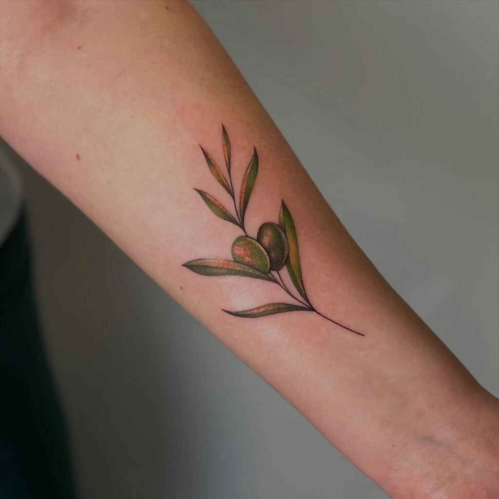 This forearm tattoo displays a delicate olive branch with two olives and slender green leaves. Its soft shading and natural hues give it a graceful, lightweight appearance.