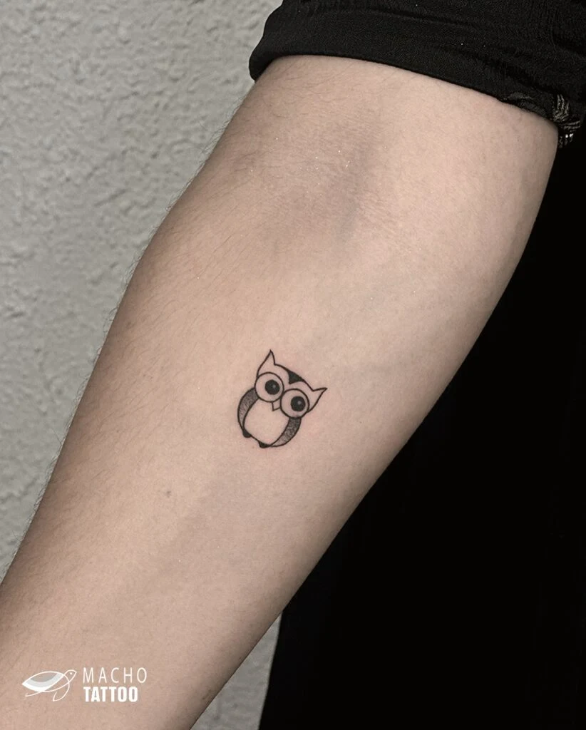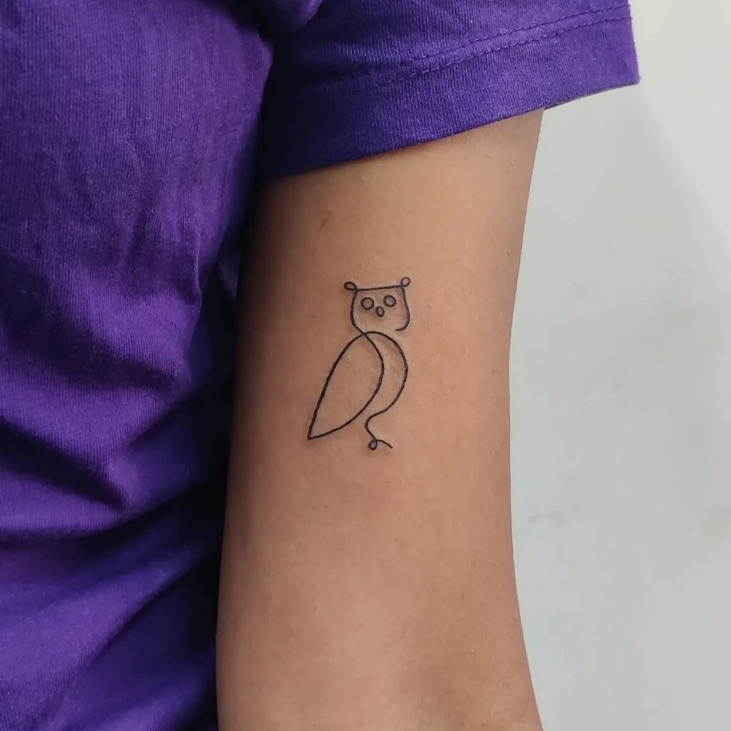 This tattoo embraces minimalism with a small, clean outline of an owl placed on the forearm. The round eyes give it a curious and approachable personality, making it a subtle yet impactful design. The simple black ink makes it timeless and versatile.