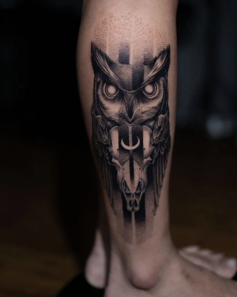 This bold leg tattoo combines the piercing gaze of an owl with the haunting detail of a skull. The intricate shading and geometric background add depth, symbolizing both wisdom and mortality. The design’s symmetrical balance highlights strength and spiritual guardianship.