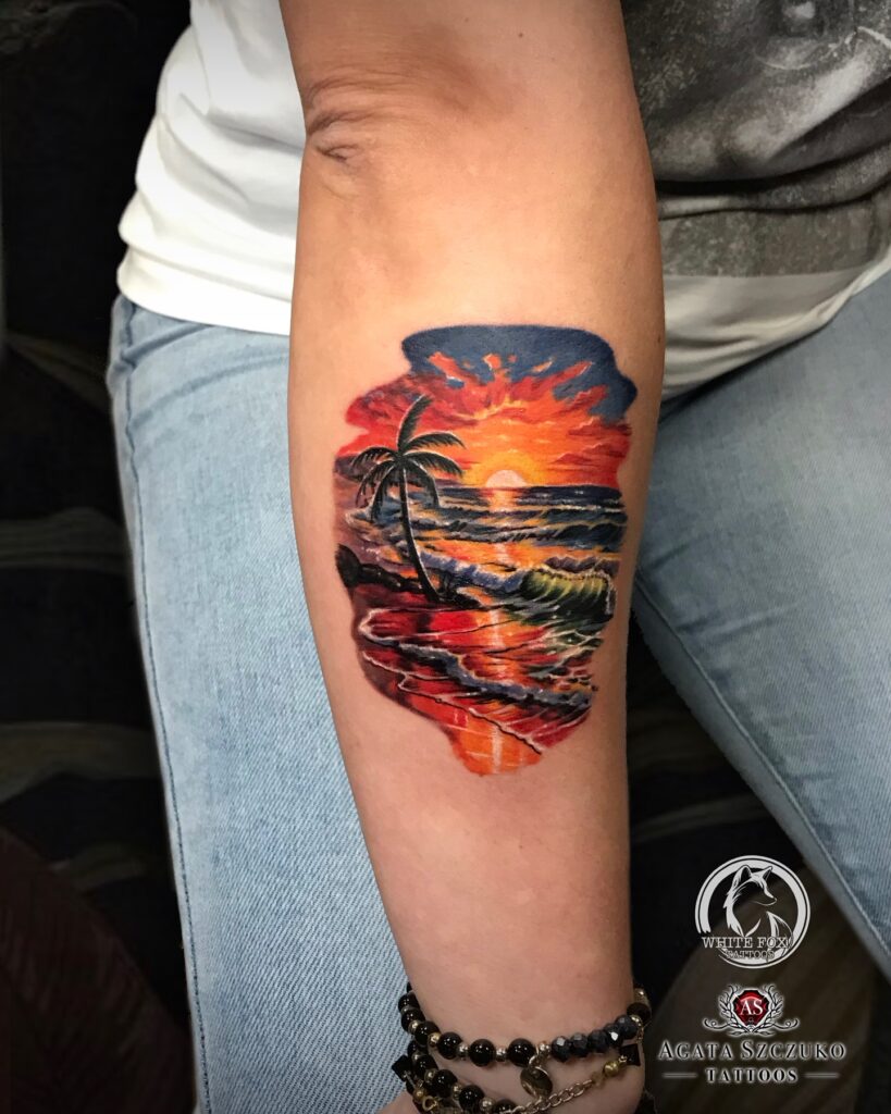 This tattoo bursts with color, blending fiery reds, oranges, and blues into a sunset scene with crashing waves and a lone palm tree. The artistry captures nature’s drama, with striking details that make it look like a painting on the skin.