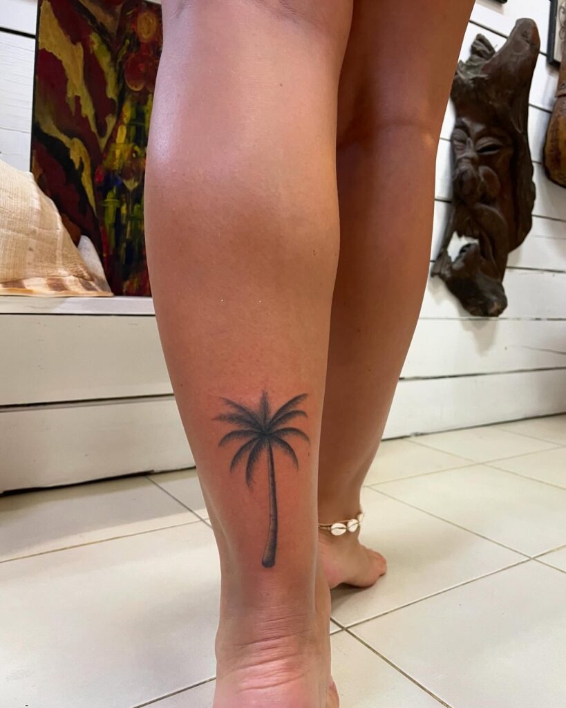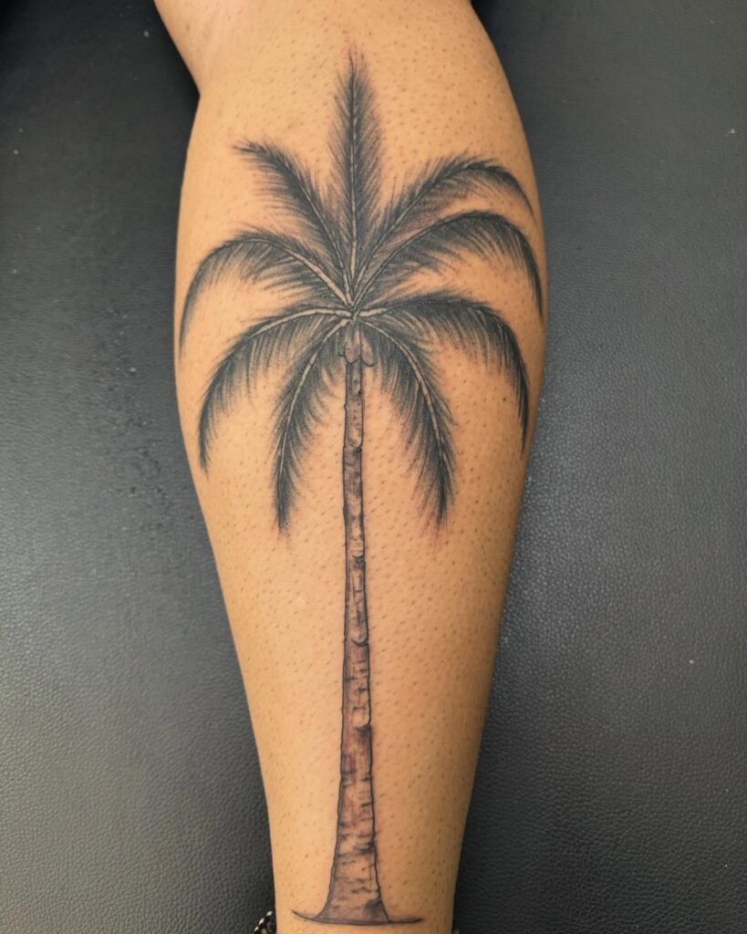 A clean and shaded palm tree rests elegantly on the calf in this design. The subtle gray shading gives the tattoo depth and realism while keeping it simple and versatile.