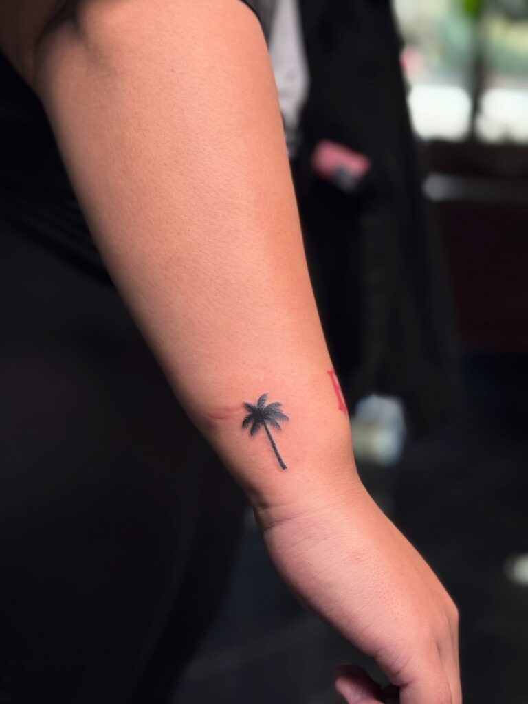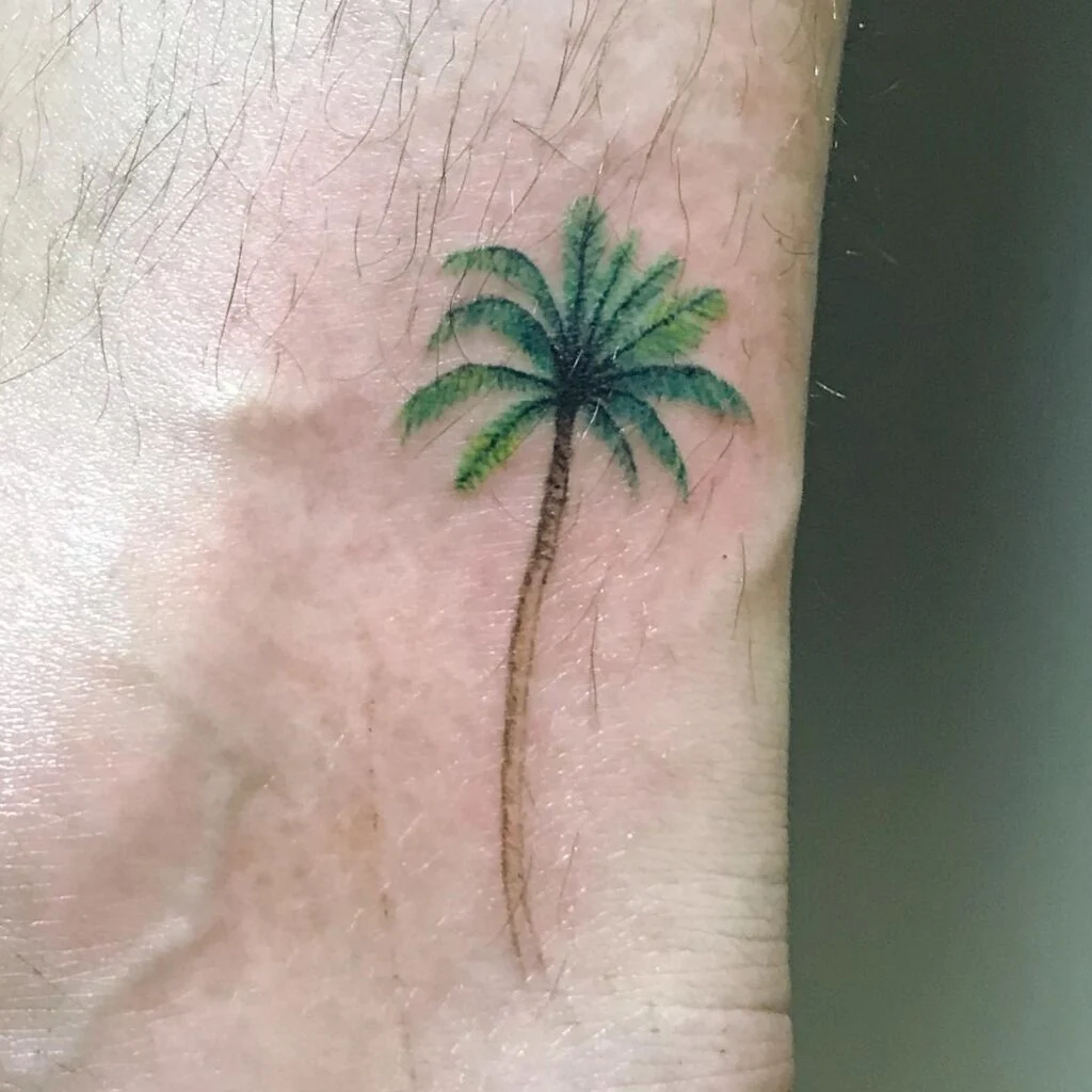 This tattoo takes a delicate approach with fine shading and natural tones. The palm tree is designed with soft green fronds and a thin trunk, giving it a gentle and almost watercolor-like feel. It’s subtle yet charming, perfectly suited for smaller areas like the wrist or ankle.