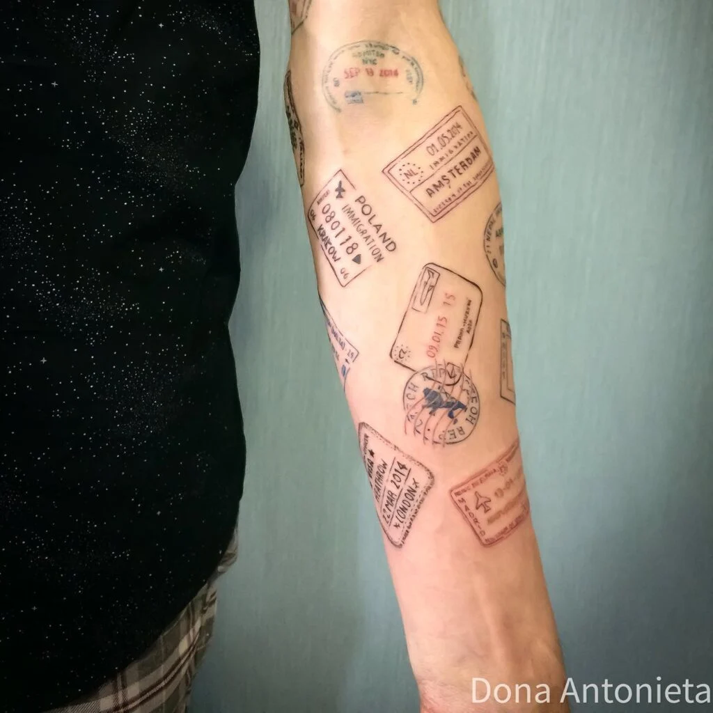 The collage effect tells a story of extensive travel, a life filled with movement across borders. It’s not just one memory, but many layered together into a visual journey. For frequent travelers, this kind of design represents the richness of experiences, showing the arm as a living passport filled with milestones.