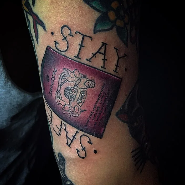 This tattoo features a passport with the words “STAY SAFE” inked prominently around it. The passport design is shaded in rich tones, with visible crest details representing protection and nationality. Its placement on the arm adds to its strong, protective presence.