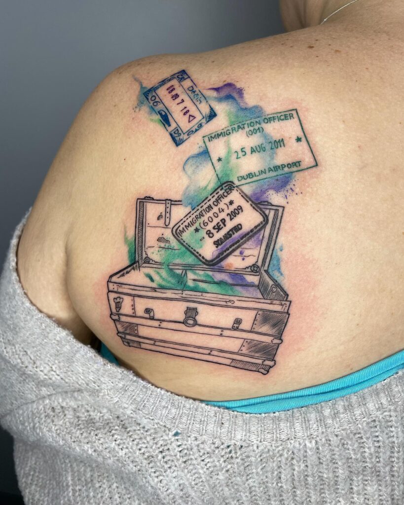 This tattoo combines imagery of an old-style suitcase with colorful passport stamps. Dates and destinations like Dublin Airport and Stansted appear vividly, layered above watercolor splashes of purple and green for a dreamy background.