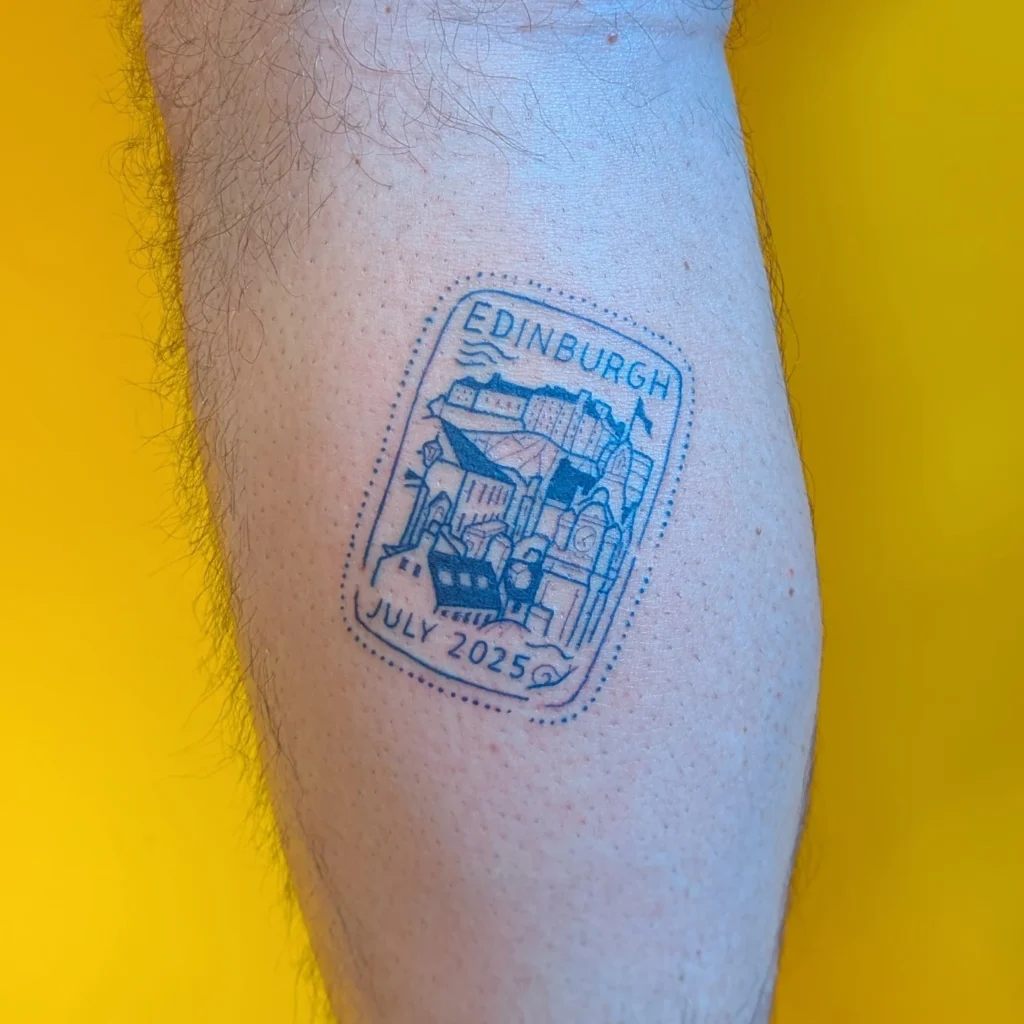 This delicate blue tattoo depicts an illustrated passport stamp from Edinburgh, dated July 2025. The design shows the city’s iconic architecture within a small rectangular border, using a dotwork style that feels light and timeless.