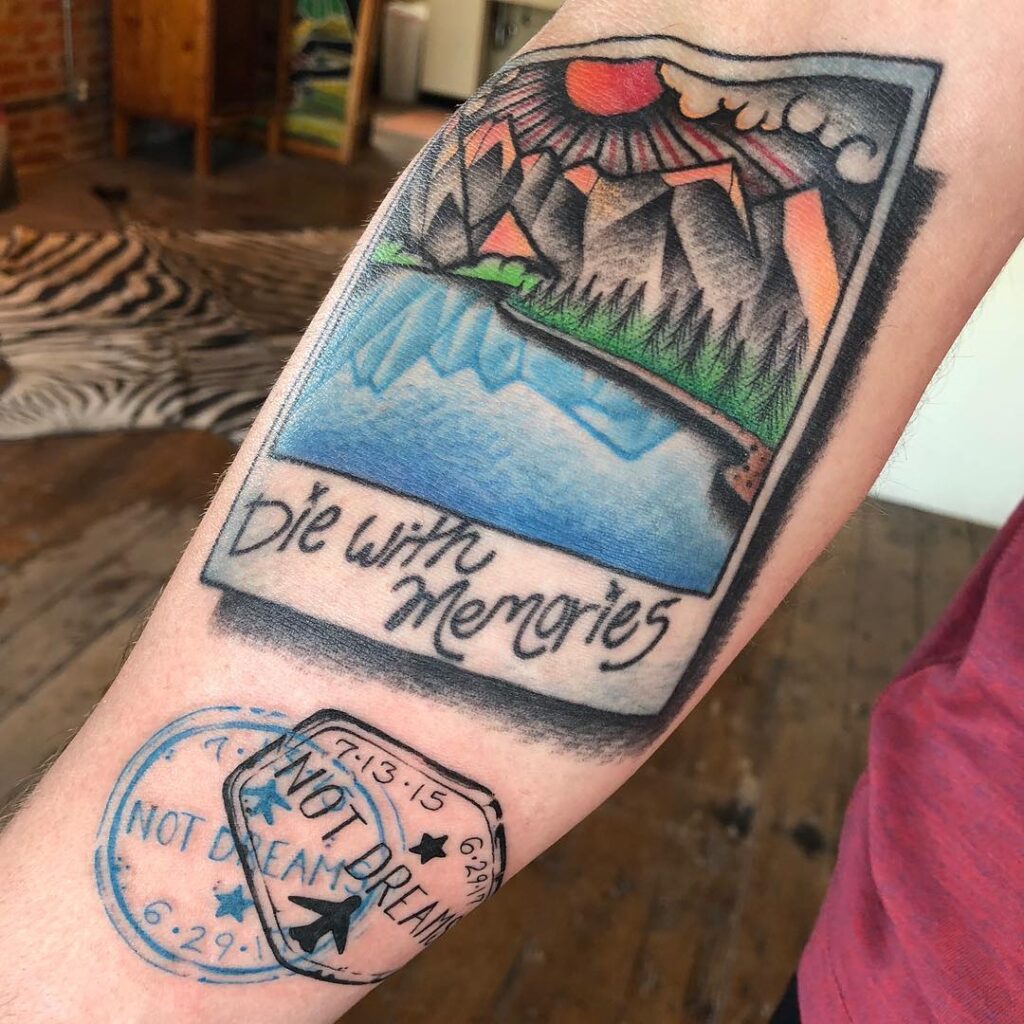 13. Polaroid Landscape with Passport Stamp Tattoo
