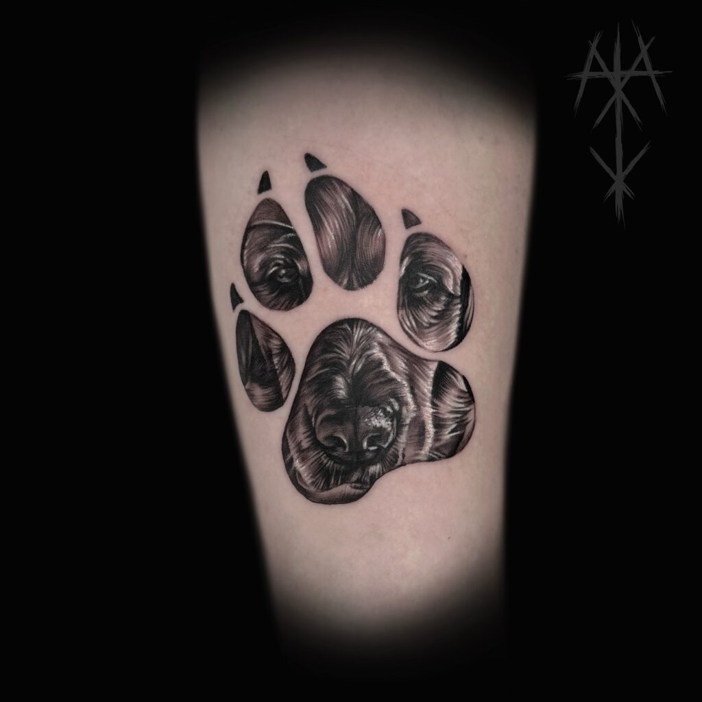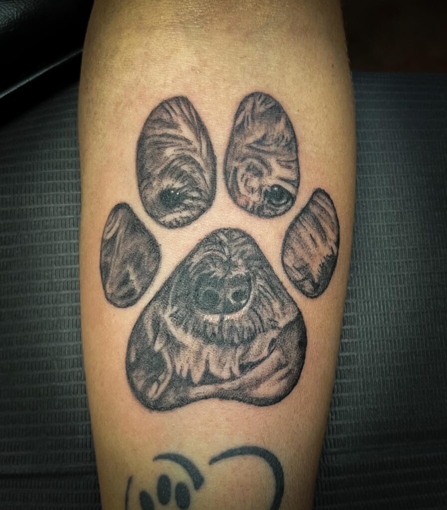 Perfect for pet lovers who want a meaningful tattoo with an artistic edge, this design turns a simple paw print into a detailed portrait. It is ideal for those seeking a one-of-a-kind tribute that feels as personal as it is visually stunning.