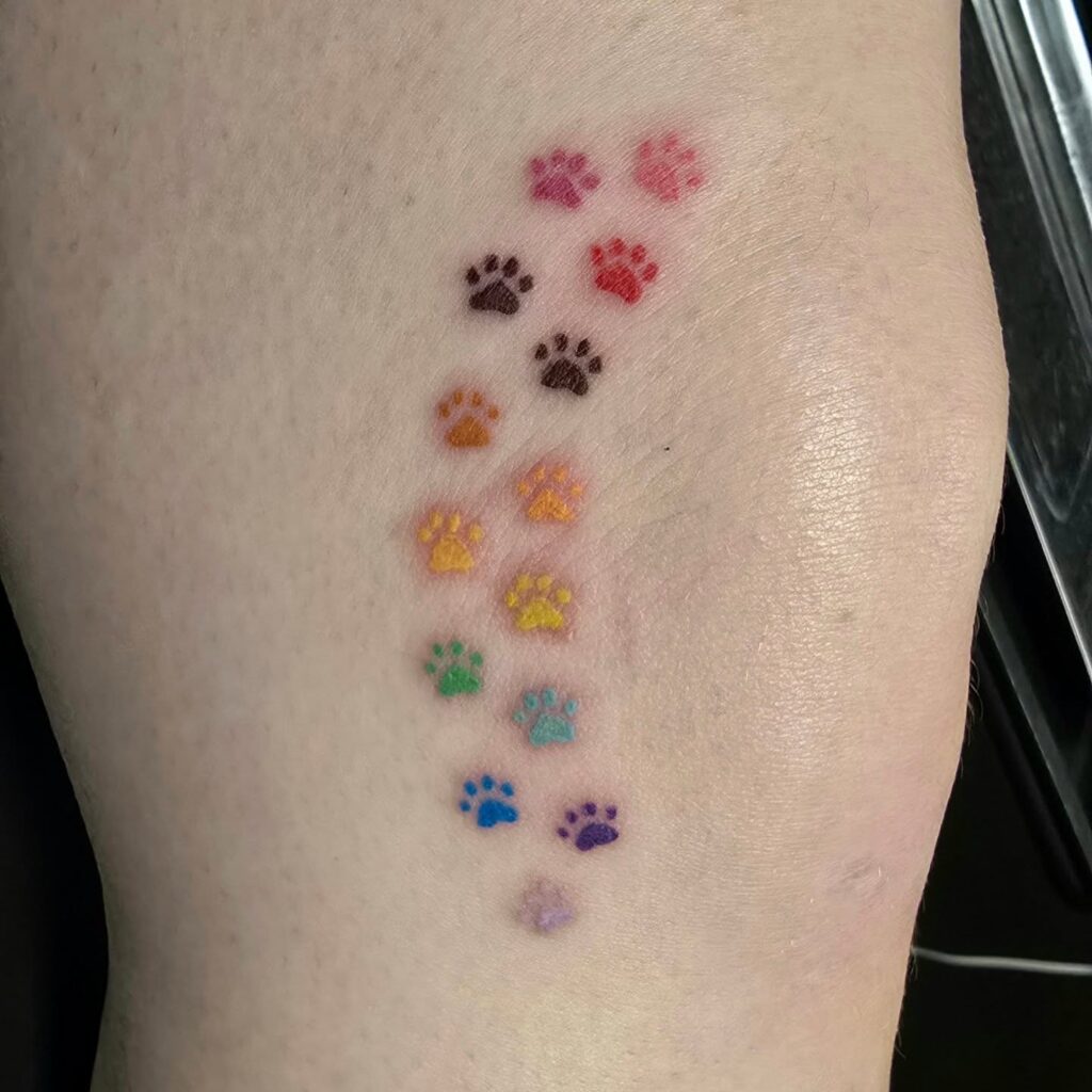 This tattoo features multiple tiny paw prints in a rainbow gradient, creating a cheerful and colorful design. The ascending pattern makes it look like a playful trail, symbolizing the joyful spirit of pets and the happiness they bring into life.