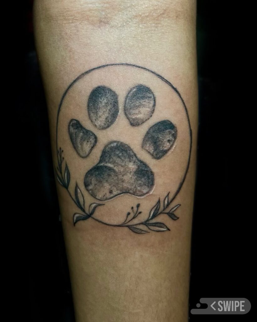 This tattoo features a realistic paw print enclosed within a delicate circular frame, accented by a subtle leafy branch. The soft shading on the paw pads gives it a natural look, as though it was gently pressed onto the skin, creating a personal and heartfelt impression.