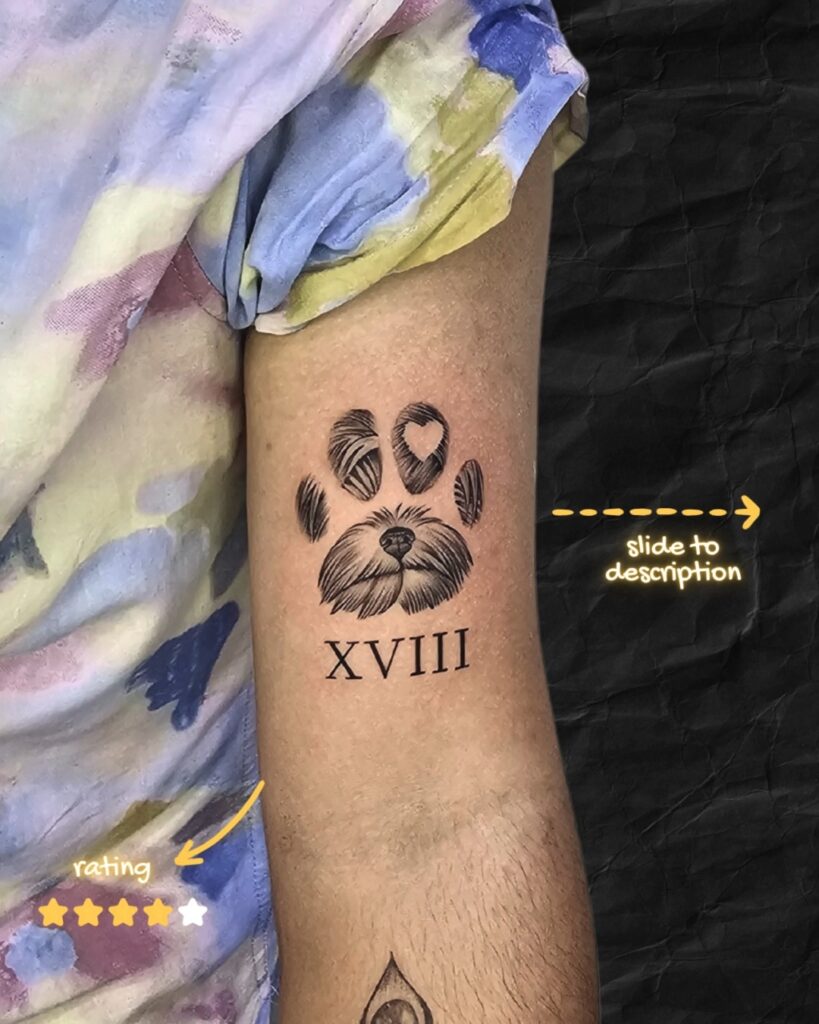 This tattoo features a paw print with finely detailed fur texture and a pet portrait cleverly placed inside the paw pads. Below it, the Roman numerals “XVIII” add a personalized and stylish touch, marking a significant date or milestone.