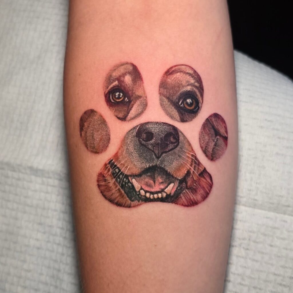 This tattoo transforms a paw print into a stunning, vibrant portrait of a smiling dog. Each pad contains a realistic section of the face, coming together to form a cohesive and eye-catching piece. The bright colors bring warmth and life to the tattoo, making it joyful and expressive.