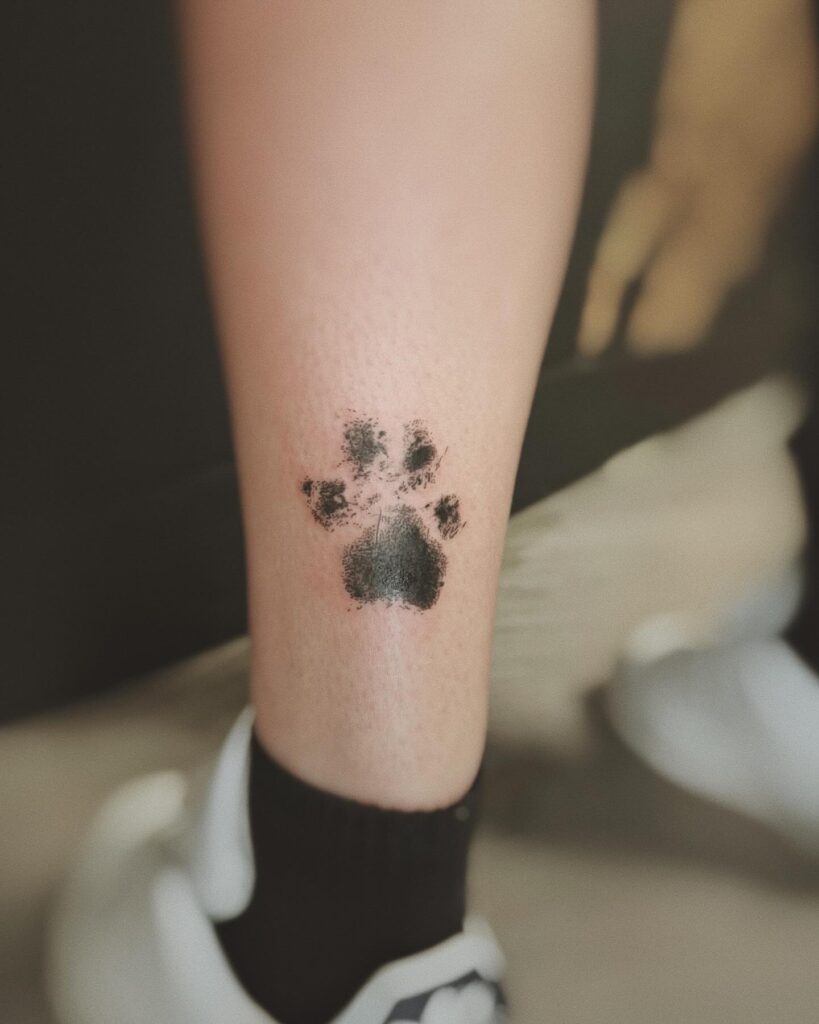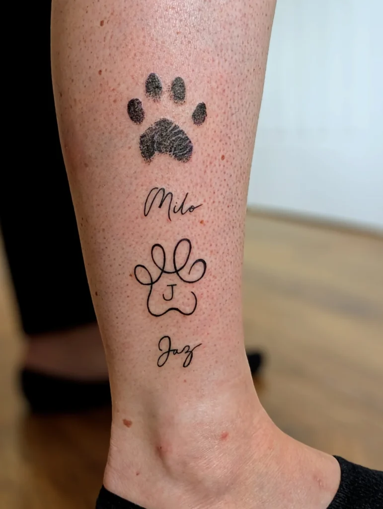 Its placement on the lower leg allows it to be visible yet personal, giving it a meaningful connection to the wearer. This design works beautifully as a way to honor beloved companions while keeping the look minimalist and stylish.