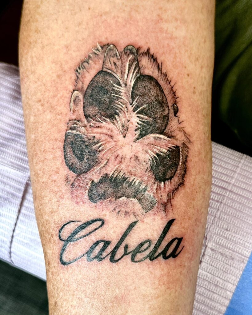 This realistic paw print tattoo uses intricate shading to capture fur details, giving it a textured, three-dimensional look. The name “Cabela” is written beneath in stylish script, adding a personal touch that turns the tattoo into a permanent keepsake.