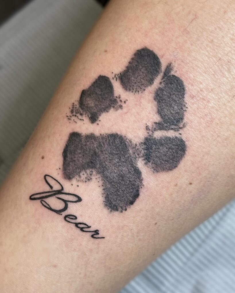 This tattoo displays a striking black paw print with natural smudging details, giving it a lifelike, stamped appearance. The name “Bear” written in delicate cursive underneath personalizes the piece and turns it into a touching memorial or celebration of a cherished pet.