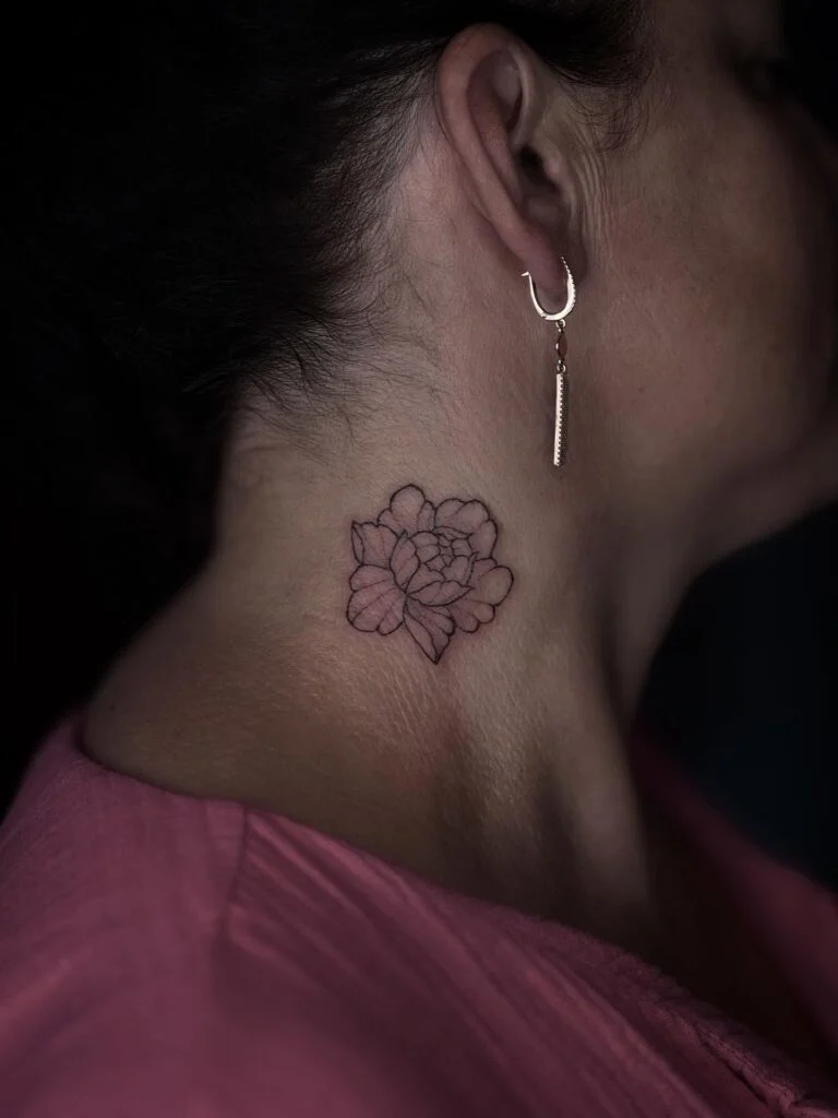 This small, delicate tattoo rests just below the ear, featuring a fine-line peony in subtle black ink. Its understated size and placement make it quietly elegant.