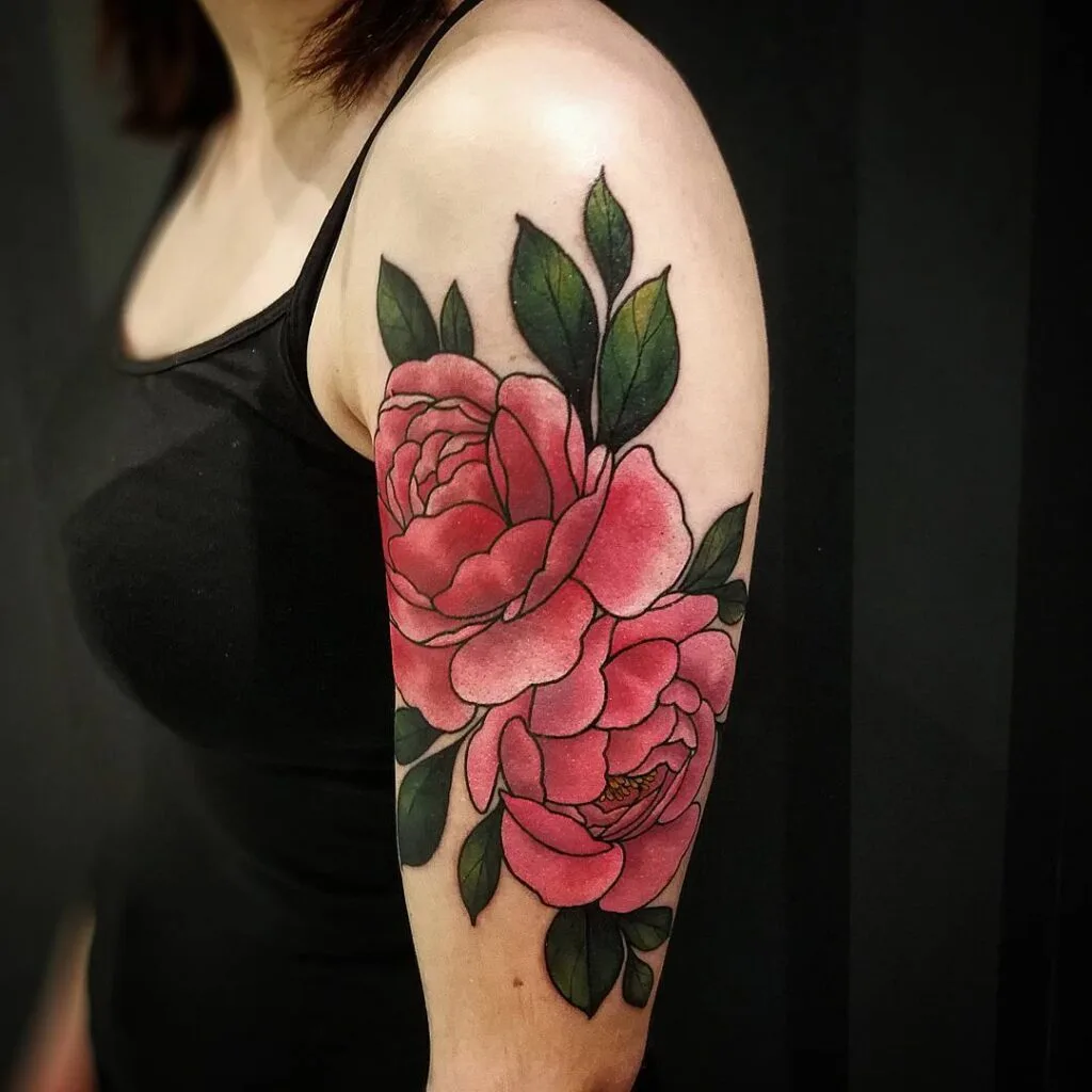 Two large, pink peonies bloom side by side on the upper arm, their soft gradients and bold outlines blending beautifully with rich green leaves. The flowers are positioned to flow naturally with the arm’s shape.