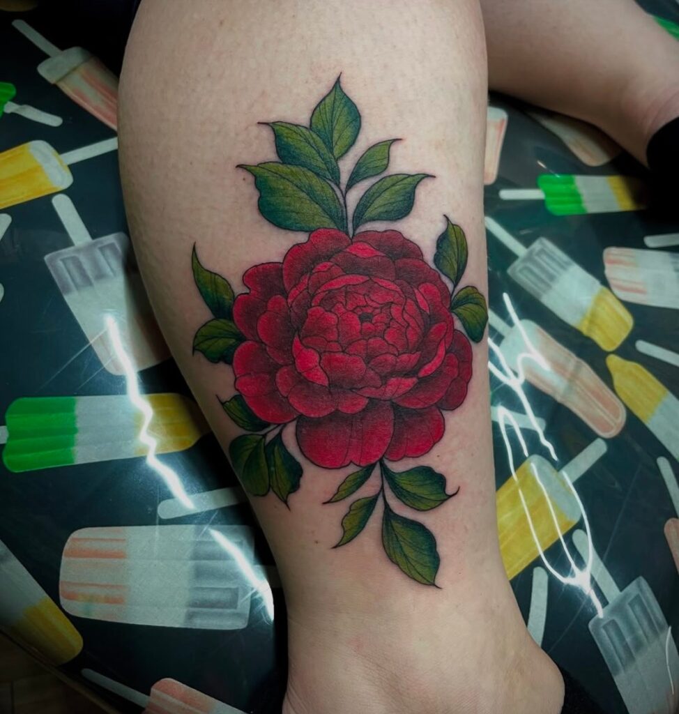 A lush red peony flourishes on the leg, framed by vibrant green leaves for a natural, botanical finish. The bright hues make the flower appear bold and lifelike, bringing warmth and energy to the design.