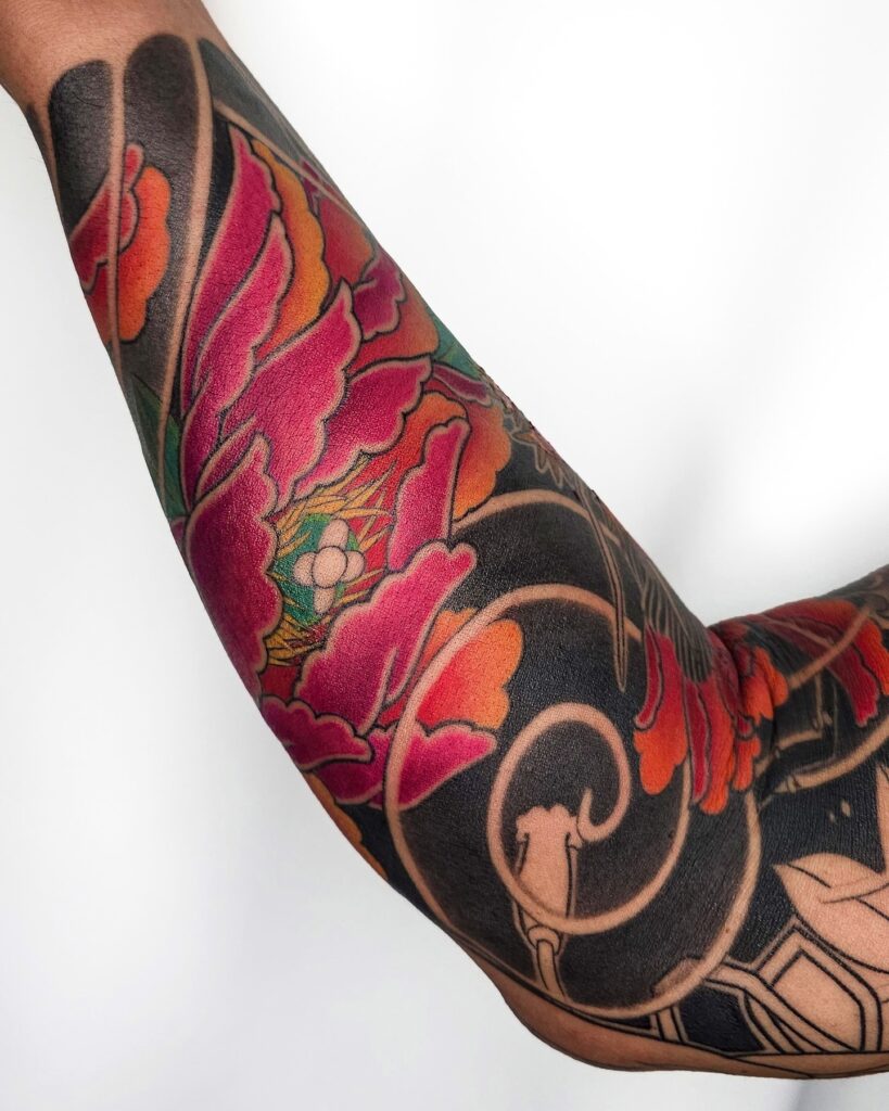 They’re very popular among women for their beauty and feminine symbolism, but men also choose peonies—often paired with bold traditional Japanese designs.
