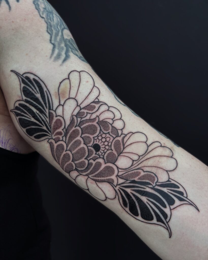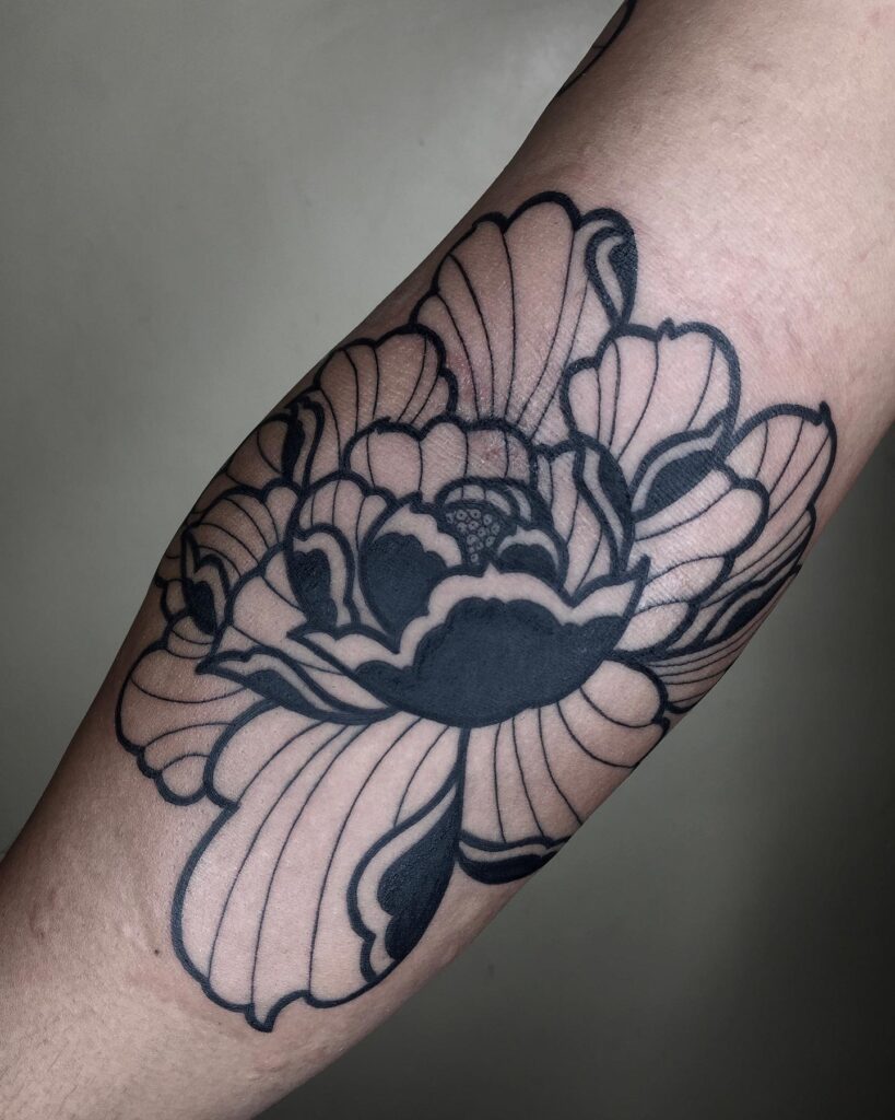 This striking tattoo reimagines the peony in solid black and fine-line details, creating a powerful monochrome floral design. The bold negative space gives depth, while the intricate linework maintains the softness of natural petals.