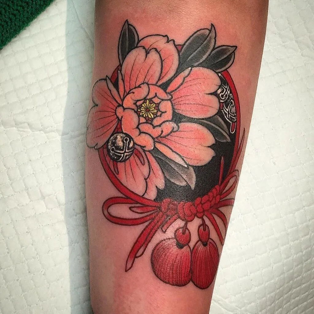 This design blends traditional Japanese elements with a vibrant peony. The soft pink petals contrast beautifully with the dark circular backdrop and red string ornament, making it both decorative and symbolic.