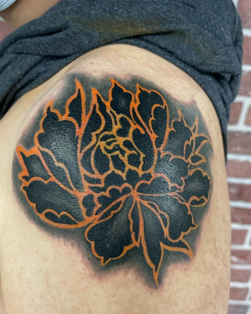 This tattoo flips traditional floral designs by using solid black shading for the peony’s body, with glowing orange outlines. Its placement on the shoulder creates a dramatic contrast against the skin.