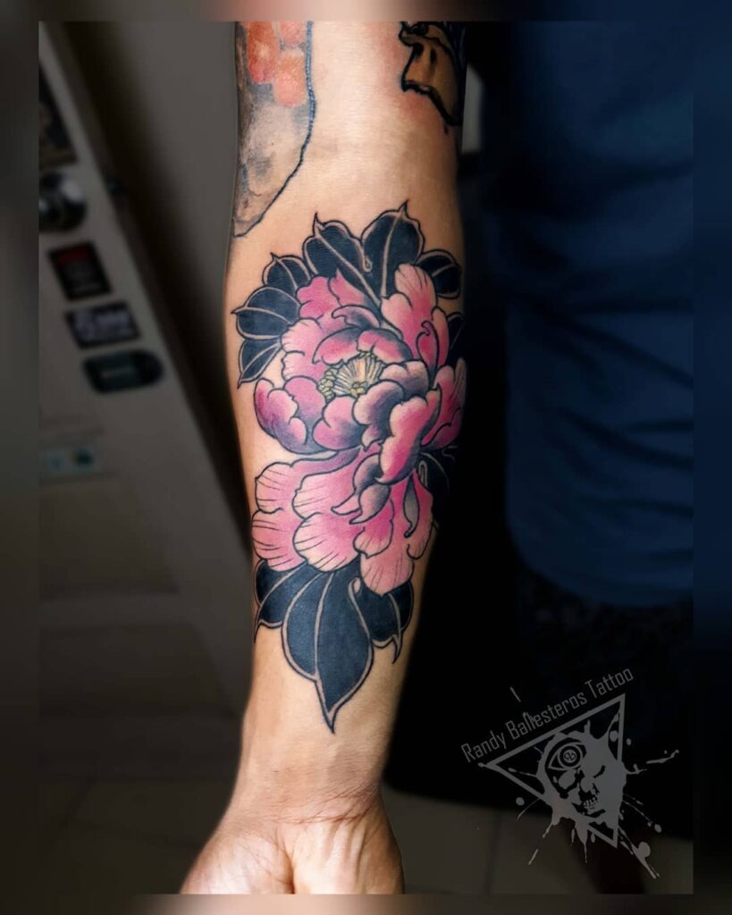 This forearm tattoo features a radiant pink peony surrounded by dark, dramatic black leaves. The color contrast emphasizes the delicacy of the petals while giving the design bold definition and intensity.