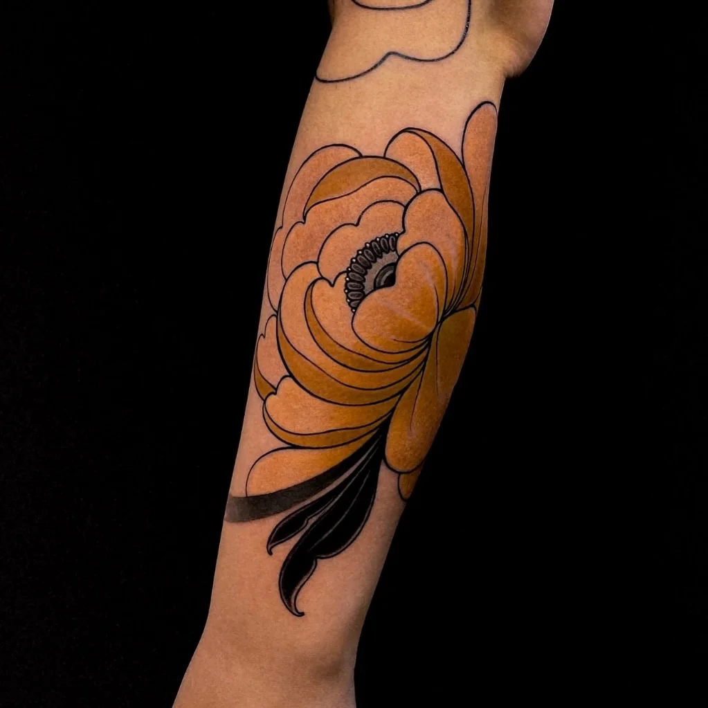 This striking tattoo features a large orange peony on the forearm, its vibrant petals unfolding in a layered bloom. The deep black shading in the center contrasts with the warm tones, creating a powerful and eye-catching design.