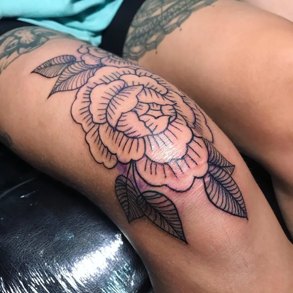 This tattoo showcases a graceful peony drawn in clean black outlines, highlighting the delicate folds of the petals and structured leaves. Positioned on the knee, the design embraces the natural curves of the body, giving it a flowing, organic feel.